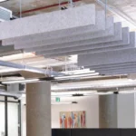 VEVO BAFL is a modular acoustic ceiling system featuring precision-cut vertical panels suspended to create clean, linear lines while improving sound absorption.