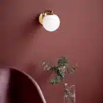 Modern style opal white glass globe cited within sleek brass base and arm. Provides a soft diffused light to an entryway or corridor.
